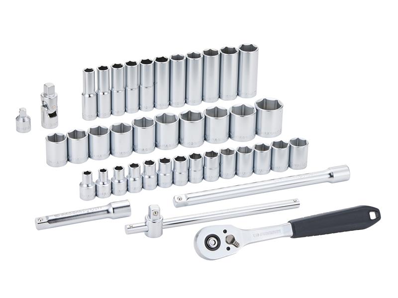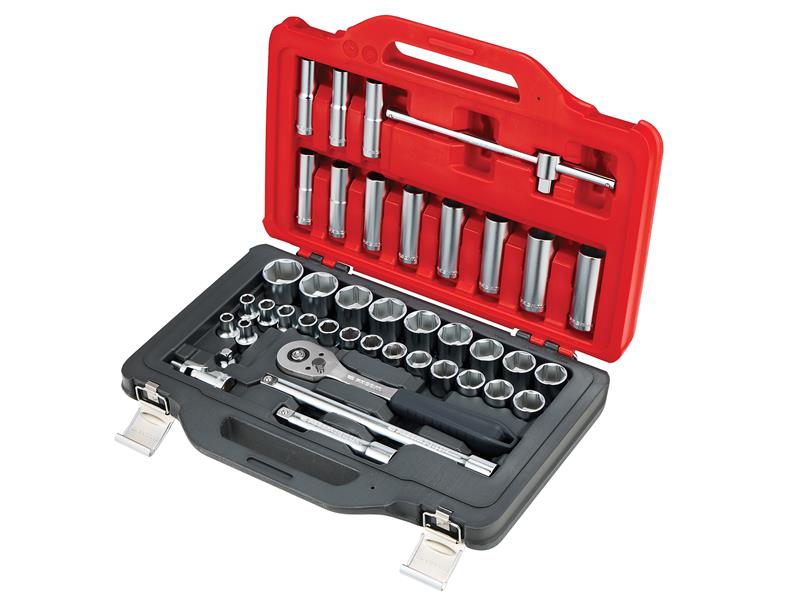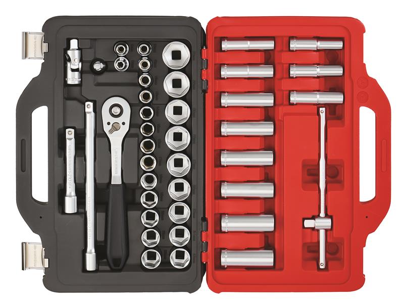 41 Piece SL.151-EP41PB Facom 1/2in Drive Socket Set in TWIN BOX case. The integrated ergonomic handle ensures easy and comfortable transport, both in the workshop and on the go. Made from highly resistant, textured plastic with sturdy metal latches. Contents: