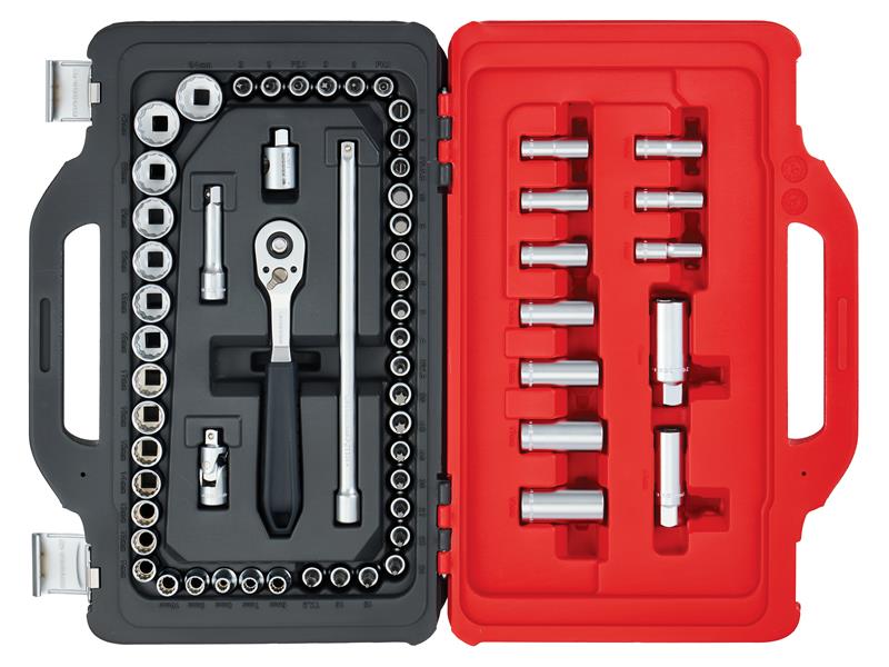 62 Piece JL.151-EP62PB Facom 3/8in Drive Socket Set in TWIN BOX case. The integrated ergonomic handle ensures easy and comfortable transport, both in the workshop and on the go. Made from highly resistant, textured plastic with sturdy metal latches. Contents: