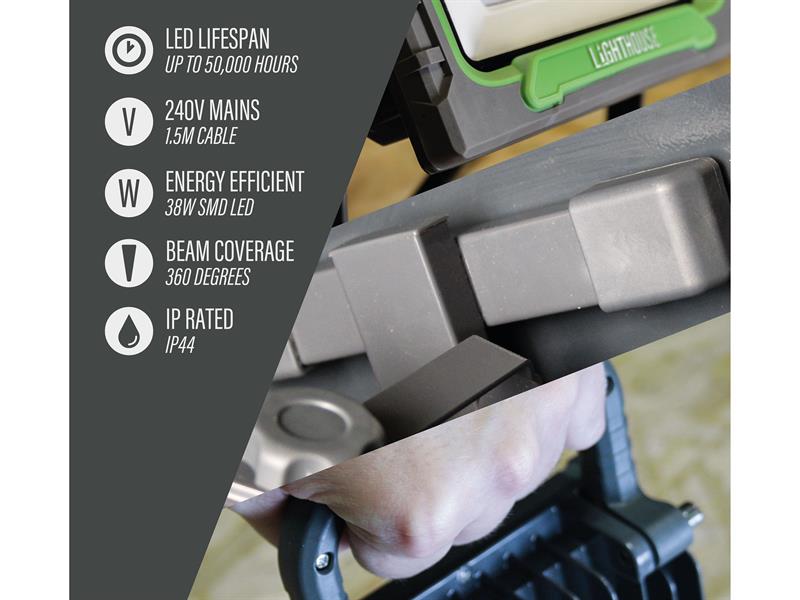 The Lighthouse Site Light is designed to provide powerful and reliable illumination for various work environments. This site light features a 38W single SMD LED head capable of delivering a brightness of 4000 lumens with a 6500k colour temperature.