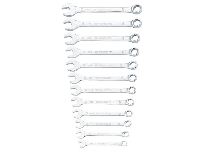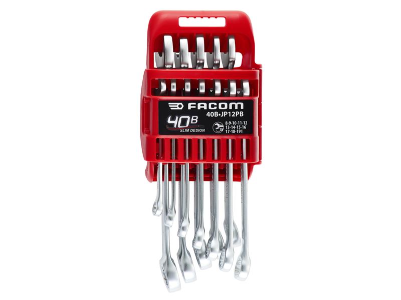 12 Piece Facom 40B.JP12PB 40B Series Slim Metric Combination Spanner Set. The 12-point OGV® profile provides more effective contact between the ring and the nut, better torque transmission, reduced risk of slipping, and longer service life. The ring end is offset by 15° for finger protection and safer, more comfortable work on flat surfaces.