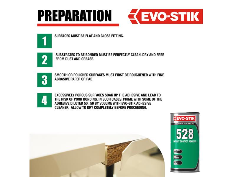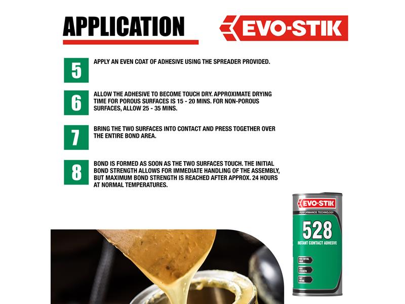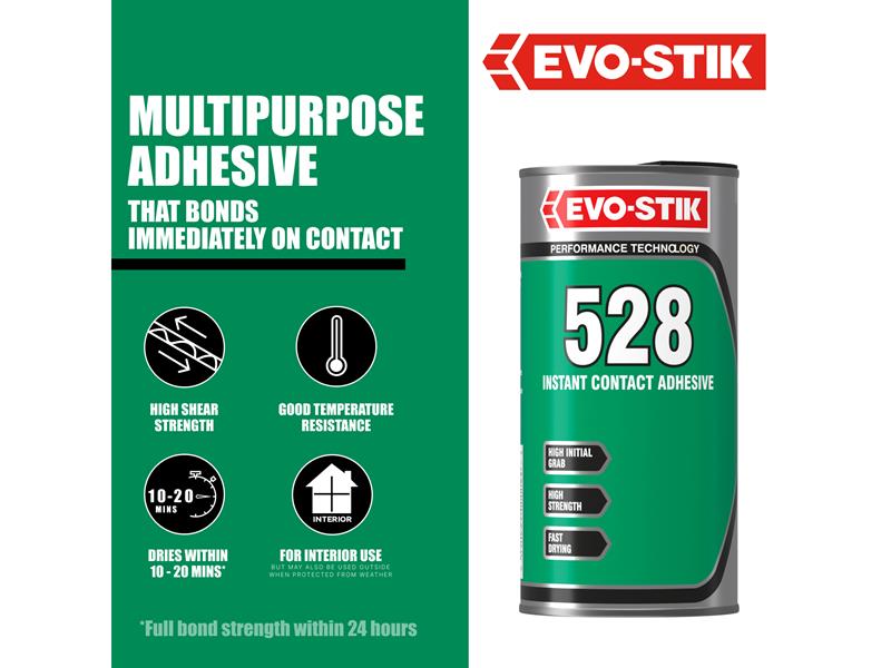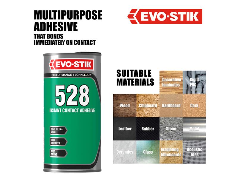BONDS: Decorative laminates, Rigid PVC, Wood, Chipboard, Hardboard, Cork, Leather, Rubber, Stone, Metal, Dense film fabrics, Ceramics, and Glass(Not suitable for use on polystyrene or cellulose painted surfaces).