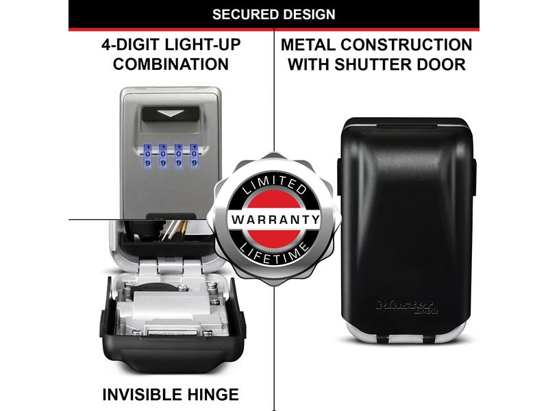 The Master Lock 5425E Light Up Dial Select Access® Wall Mounted Key Box is packed with high quality features and it is fitted with an easy-to-set 4 digit combination security lock with a large easy to grip release lever, and 10,000 possible combination options. Light up back lit dials allows use in low light situations. Plastic full front weather cover protects the Select Access from the elements and offers more discretion.