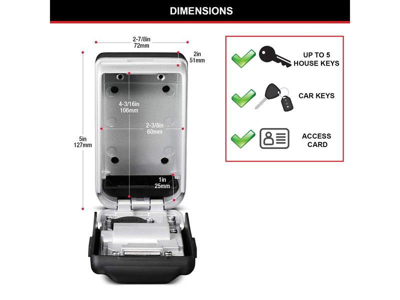 Enables the safe storage of house keys or even cash. Door keys can be safely left for children to get in after school, for an elderly family member you need to visit on a regular basis, or for just storing keys safely.