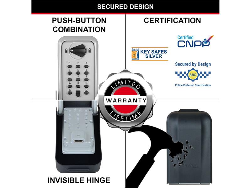 The 14 push button key lock box is resettable to allow you to set your own personal combination and has 16,000 possible combination options. Enables the safe storage of house keys, cards or even cash. Door keys can be safely left for children to get in after school, for an elderly family member you need to visit on a regular basis, or for just storing keys safely.