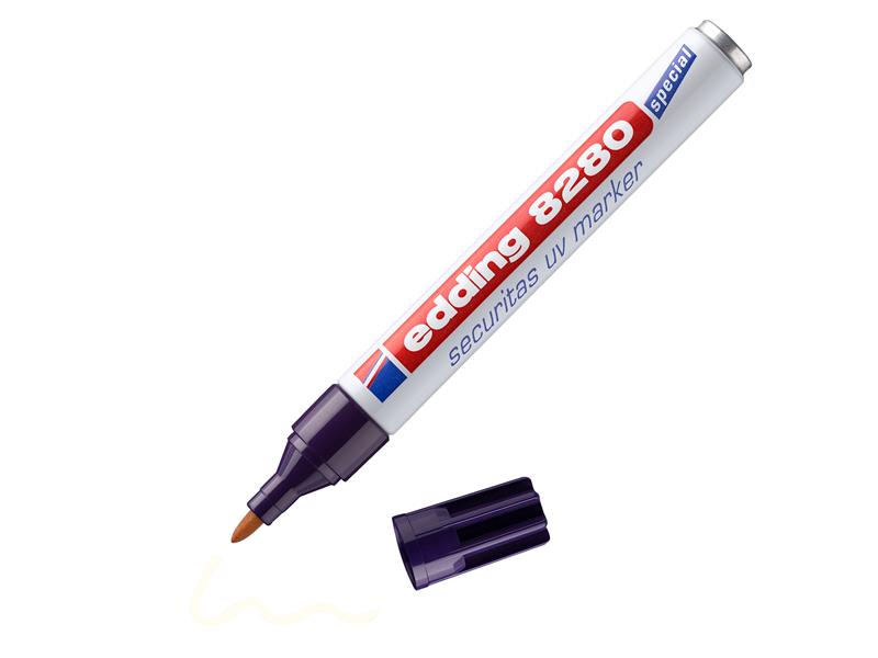 The edding 8280 Securitas UV Marker has a permanent, quick-drying ink that only becomes clearly visible under UV light. Its round nib has a stroke width of 1.5-3mm. The high-quality aluminium barrel is made from 100% post consumer recycled aluminium (PCR). Ideal for hidden marking and labelling of almost all materials.