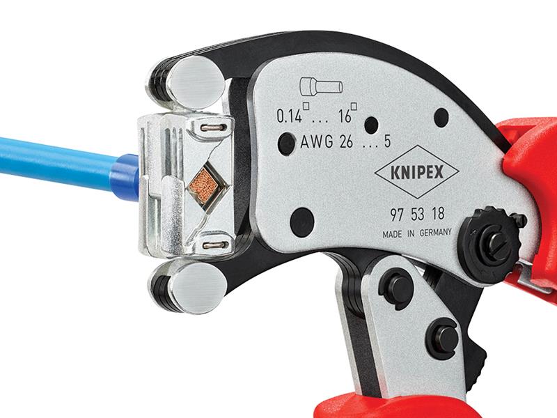Knipex Twistor16® Self-Adjusting Pliers for crimping wire end sleeves according to DIN 46228 parts 1 + 4. Its square crimp profile has a high-capacity range of 0.14 to 16mm². The 360° rotatable crimping die has 8 tactile locking positions. Self-adjustment to the desired size of wire end sleeve. No crimping errors due to using the wrong crimping die or to an incorrect setting.
