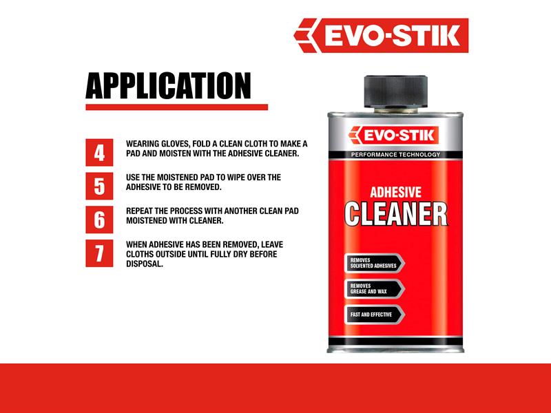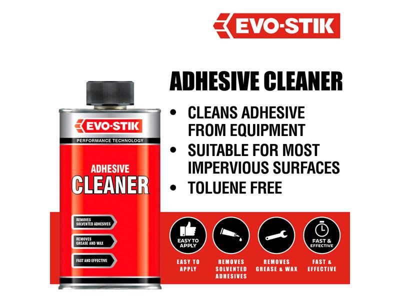 The Evostik adhesive cleaners are fast and effective in removing the residue from solvented adhesives, they are specially designed to tackle wet or dry adhesives, Even small areas of old adhesive can be removed without a fuss. They are ideal for removing grease, wax and similar stains.