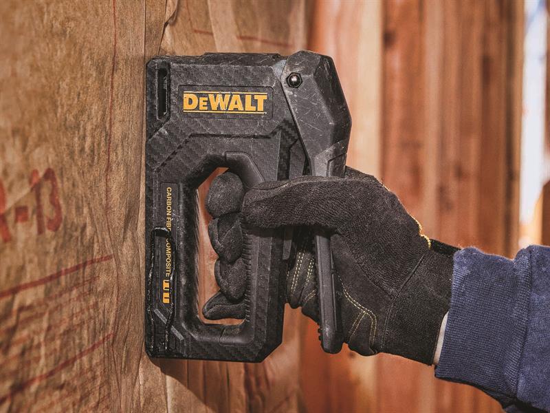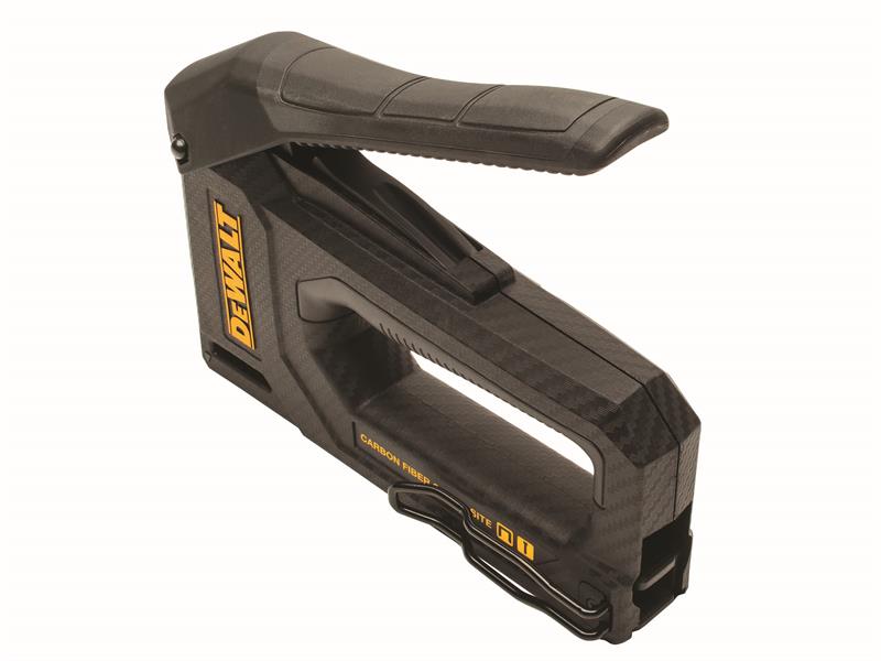 The DEWALT® Carbon Fibre Composite Staple Gun features a carbon fibre light-weight composite housing which helps to reduce muscle fatigue. The quick and easy button load design and a low fastener indicator ensures the supply is ideal for repetitive jobs, like insulation and roofing or carpet underlayment. A reversible belt hook provides left or right-handed access.