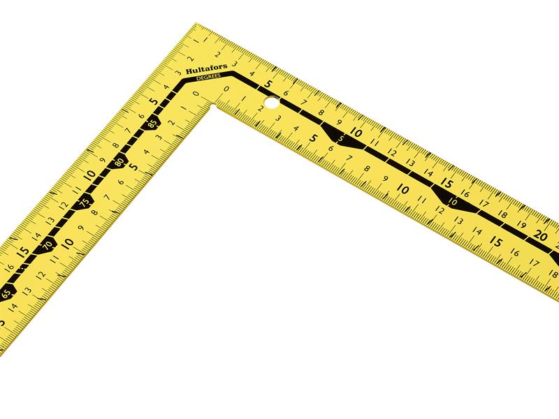 The Hultafors Carpenters Square is made of 1.5mm thick high-strength steel, cut with precision laser, provides a durable and high precision product. There is a millimetre graduation on the front and back side of the square. There is also an additional angle scale on the backside, with two pivot points, one for 1-20° and one for 20-89°.