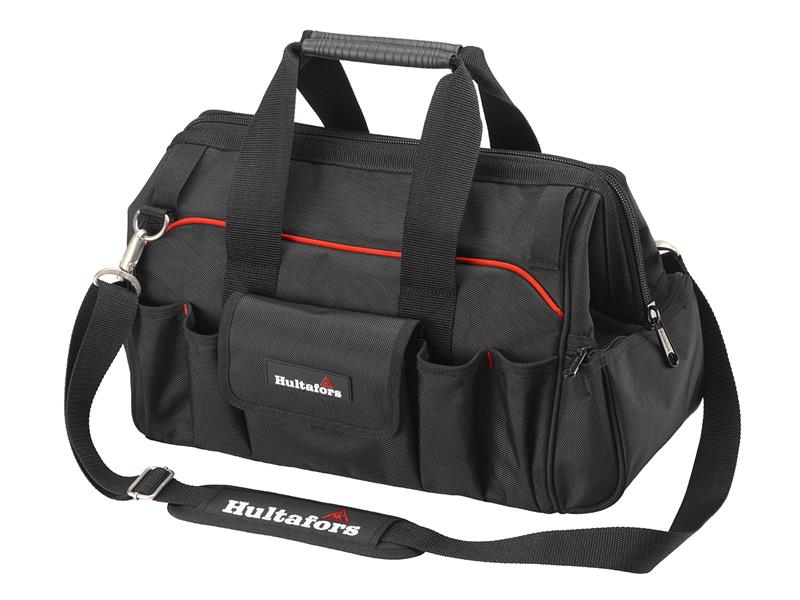 The Hultafors Craftsmans Open Wide Tool Carrier opens wide and stays open thanks to a frame, giving you easy access to your tools while you work. It has a large compartment with multiple tool holders and two zippered pockets for small items and bits. It closes easily with a zipper to protect your tools. The zippers are made of nylon with durable metal pullers that are easy to grip, even with gloves on. Made from extremely durable ballistic polyester, 1680 Denier which gives it maximum wear resistance and longevity. The rubber handles provide a comfortable grip. It also comes with an adjustable shoulder strap.