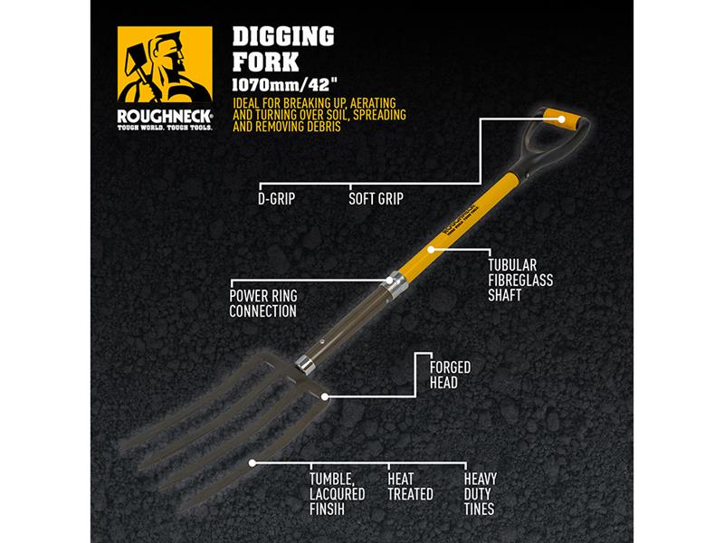 The Roughneck® Digging Fork is ideal for breaking up, aerating and turning over soil, spreading and removing debris. Built to last, the heat-treated, heavy-duty tines have a corrosion-resistant, tumble lacquered finish. The Power Ring socket, steel-reinforced plug, provides a stronger blade to handle connection. With a tubular fibreglass shaft and a soft grip, D-shaped handle for comfort in use.