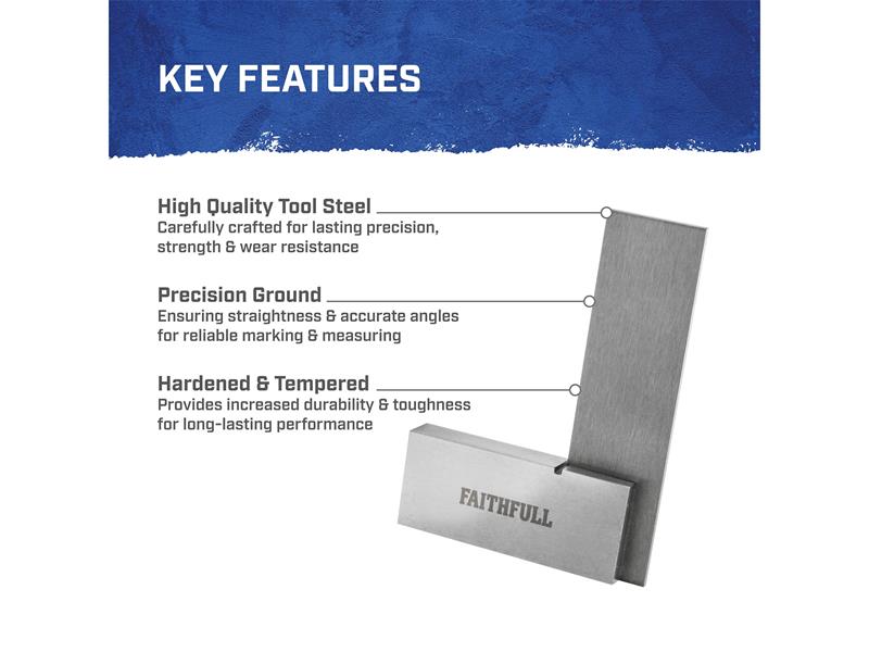 The Faithfull Engineers Square has been carefully crafted from high quality tool steel. The stock and blade are precision ground to ensure straightness and accuracy, and the spring steel blade is hardened and tempered for increased durability.