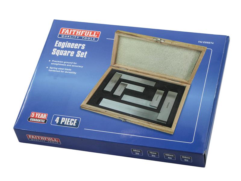 Faithfull Engineers Squares Set supplied in a wooden storage case. Carefully crafted from high-quality tool steel, these squares are accurate to BS939 Grade B standard. The stock and blade are precision ground to ensure straightness and accuracy, and the spring steel blade is hardened and tempered for increased durability.