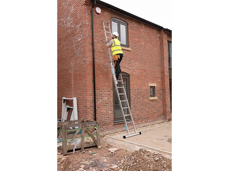 Secure locking catches keep ladder sections safely locked in position while working or transporting. Wrap-around top clips with smooth-glide runners for reduced wear and longer service life. Fitted with a heavy-duty, wide stabiliser with slip-resistant feet for maximum safety.