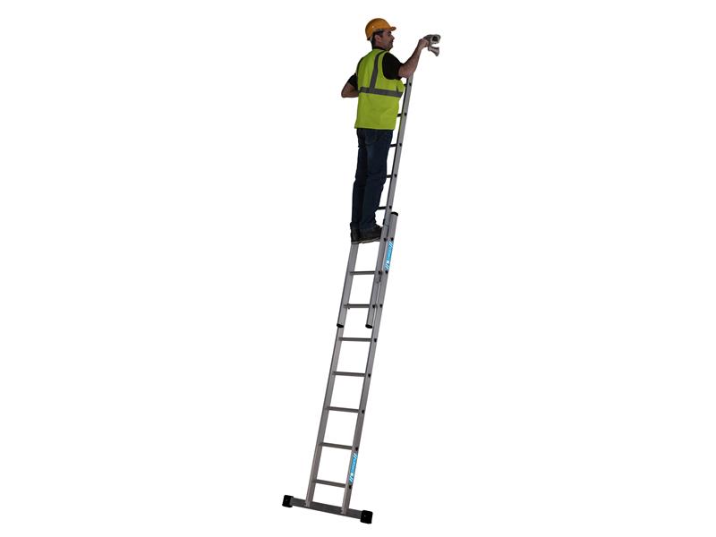Secure locking catches keep ladder sections safely locked in position while working or transporting. Wrap-around top clips with smooth-glide runners for reduced wear and longer service life. Fitted with a heavy-duty, wide stabiliser with slip-resistant feet for maximum safety.