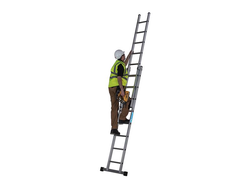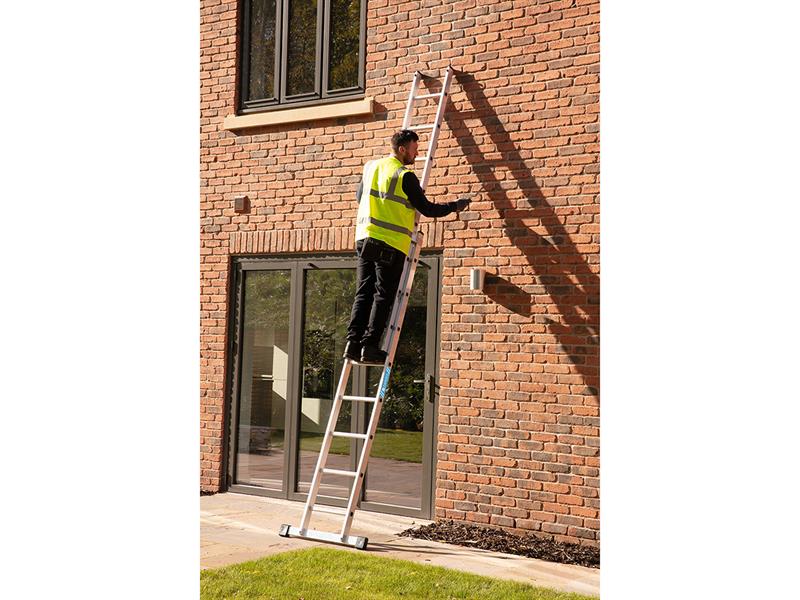 Secure locking catches keep ladder sections safely locked in position while working or transporting. Wrap-around top clips with smooth-glide runners for reduced wear and longer service life. Fitted with a heavy-duty, wide stabiliser with slip-resistant feet for maximum safety.
