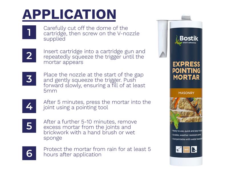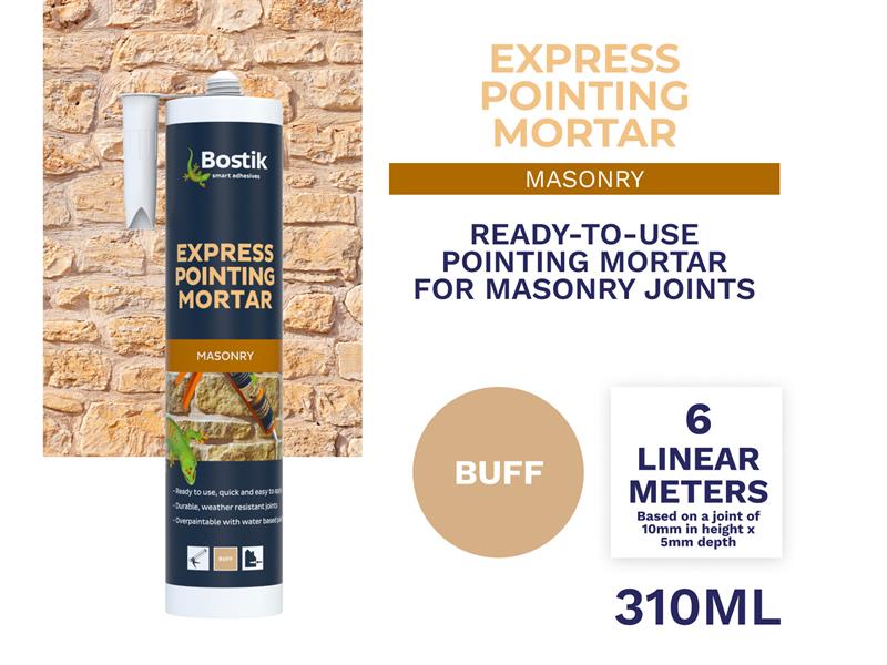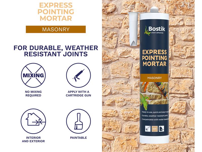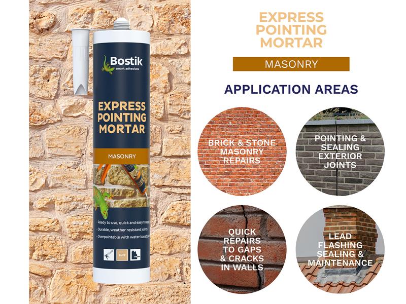 The Bostik Express Pointing Mortar is suitable for masonry joints. It can also be used to seal between stones, brick slips and around lead flashing. No primer is required on most substrates, even on slightly damp surfaces. It can be overpainted where required.