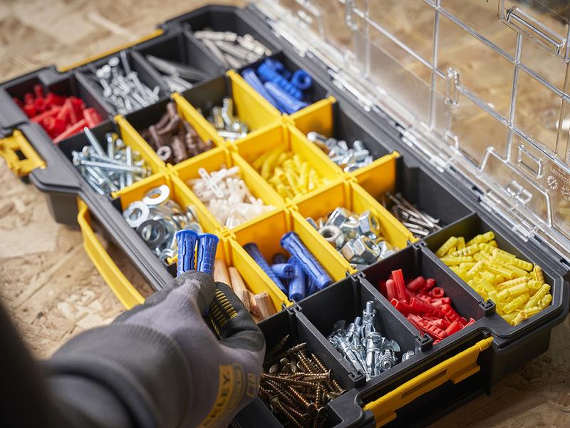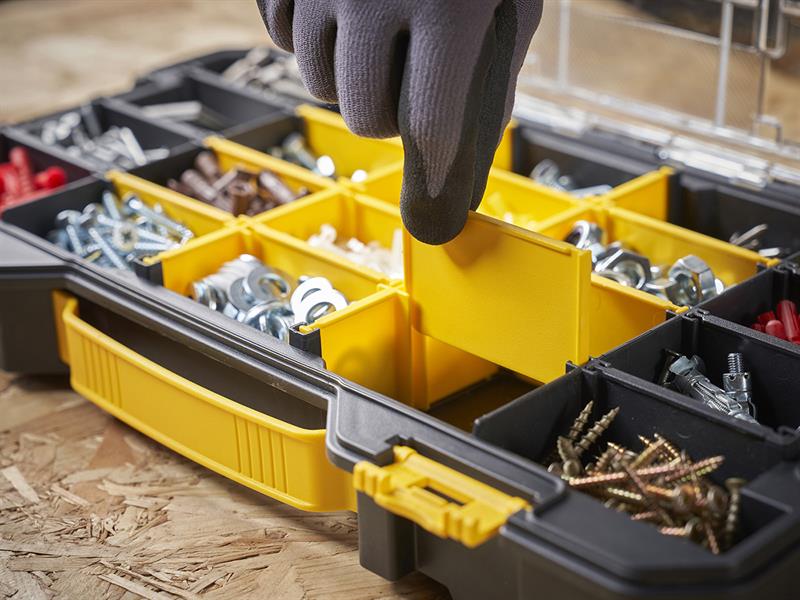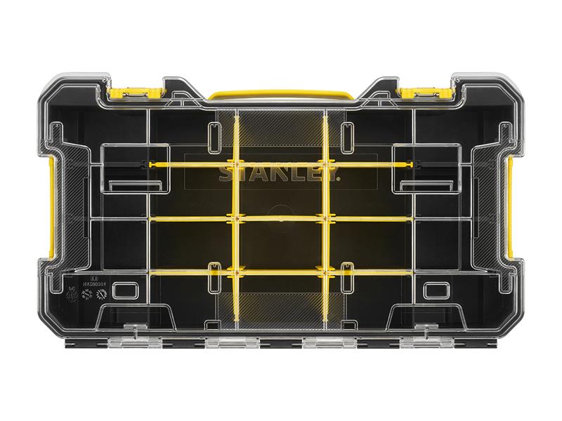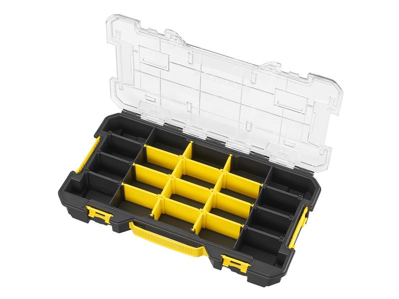 The STANLEY® FATMAX® PRO-STACK™ Large Shallow Organiser features removable dividers, ideal for storing small parts, components and accessories. Its transparent lid provides clear visibility of contents. Fitted with carry handle for comfort and easy transportation.