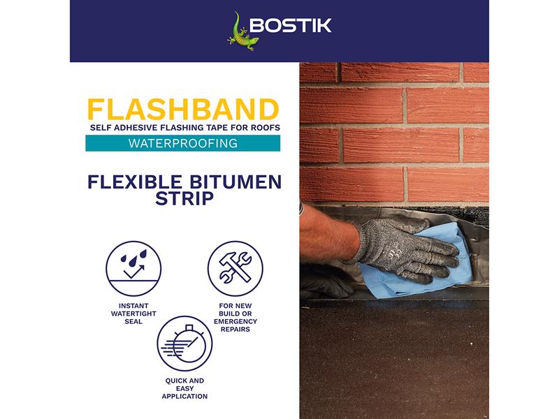 Bostik Flashband is a self-adhesive flashing strip for roofs, giving an instant watertight seal. Excellent adhesion to a wide range of building materials. Quick and easy-to-use, ideal for emergencies.