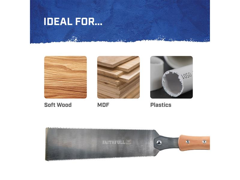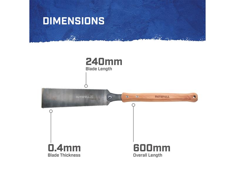 The Faithfull 240mm Double Sided Pull Saw has 18 teeth per-inch on one side and 12-7 teeth by-inch on the other. The blade is constructed using SK5 steel and features a chemical nickel plating that enhances its resistance to wear and corrosion. The blade is thin and flexible which allows the user to reach tight spaces and to achieve a flush cut. Some common uses for this type of blade are trimming dowels, plugs and excess protruding materials.