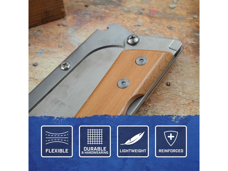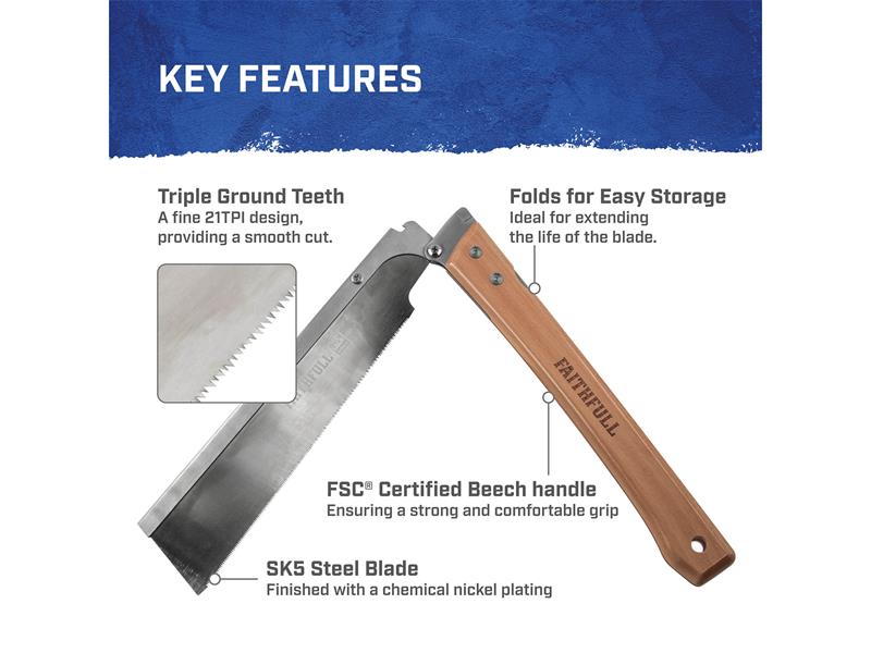 The Faithfull Folding Pull Saw is built for woodworking and precision cutting. Its blade boasts a fine 21-teeth per-inch design that is triple-ground, providing a smooth cut and a longer lifespan. The blade is constructed using SK5 steel and features a chemical nickel plating that enhances its resistance to wear and corrosion.