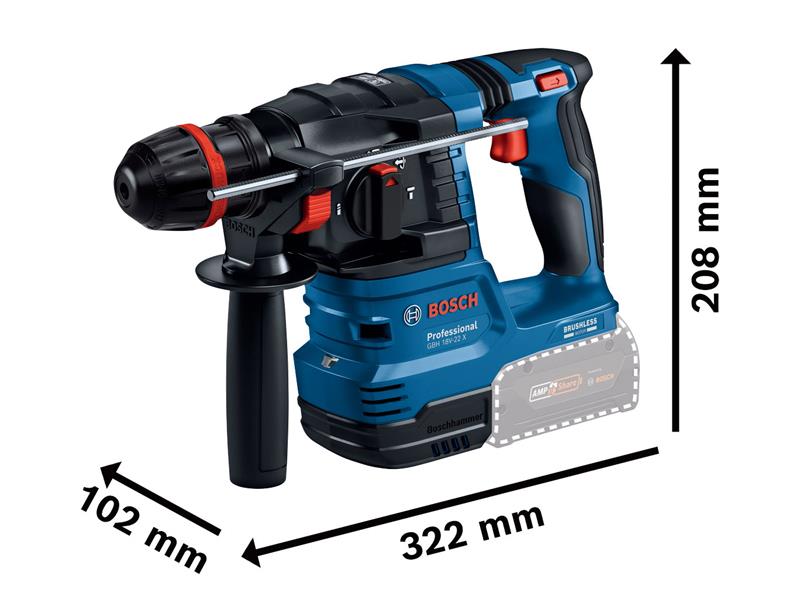 Bosch GBH 18V-22 X Professional Rotary Hammer with the ONECHUCK, a single chuck that can fit SDS-plus, cylindrical and hex drill bits for your wide range of applications. Its high power output is delivered by its potent Bosch 18V brushless motor combined with constant speed. KickBack Control and Vibration Control increase user protection against accidental jams and vibration exposure.
