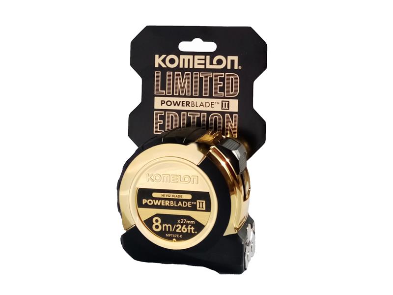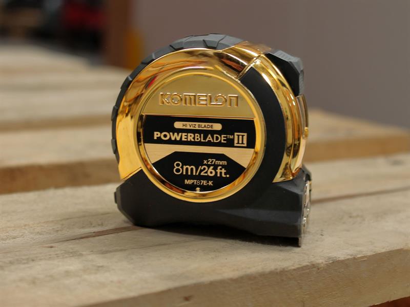 The Komelon Gold PowerBlade™ II Pocket Tape has a Dura NY nylon coated steel dual printed blade with vertical blade markings on the reverse and patented hi-vis blade printing. The blade features both metric and imperial graduations.