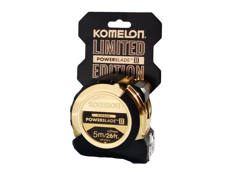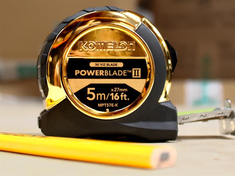 The Komelon Gold PowerBlade™ II Pocket Tape has a Dura NY nylon coated steel dual printed blade with vertical blade markings on the reverse and patented hi-vis blade printing. The blade features both metric and imperial graduations.