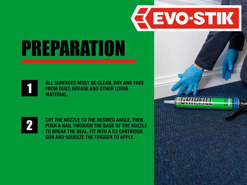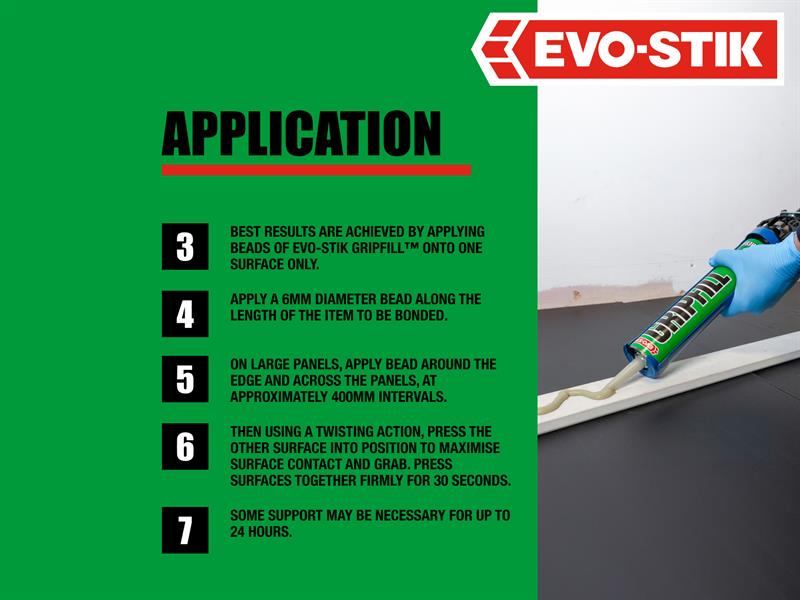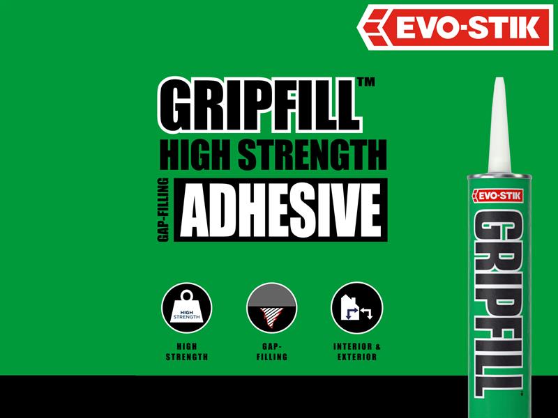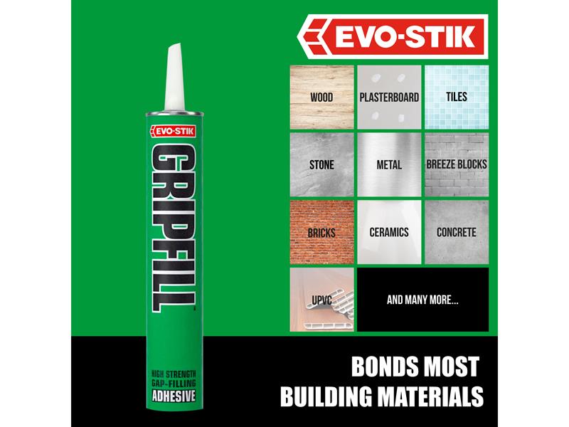 Evo-stik Gripfill is a solvent-borne, filled rubber resin adhesive, developed to bond virtually any rigid materials together, regardless of the evenness of the surface. Gripfill is a high strength, one part, gap filling adhesive specially formulated to bond a large variety of materials.