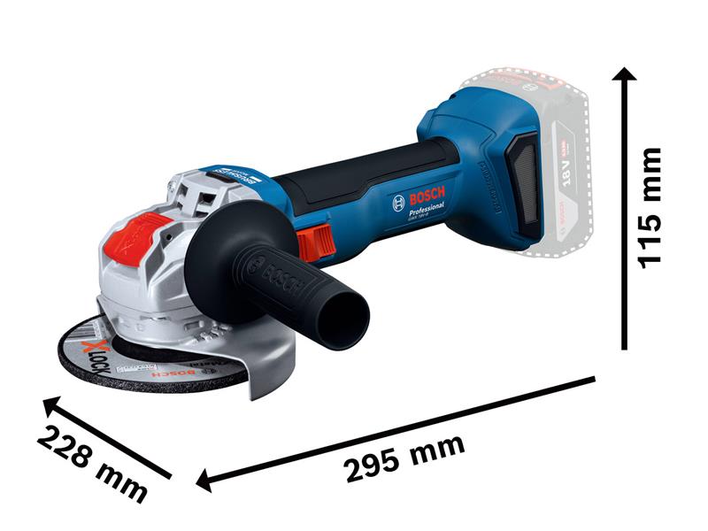 The Bosch Bosch GWX 18V-8 Professional X-LOCK Angle Grinder packs 800W of equivalent corded power, making it an ideal combination of comfort and performance for light-duty cutting and grinding tasks. You can expect the fastest cutting performance in light-duty tasks such as cutting rebar, metal sheets, PVC and tiles, or deburring light metal.