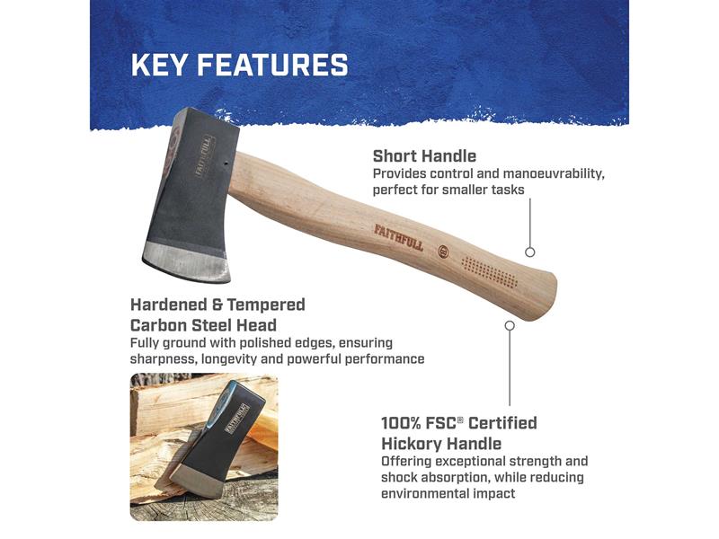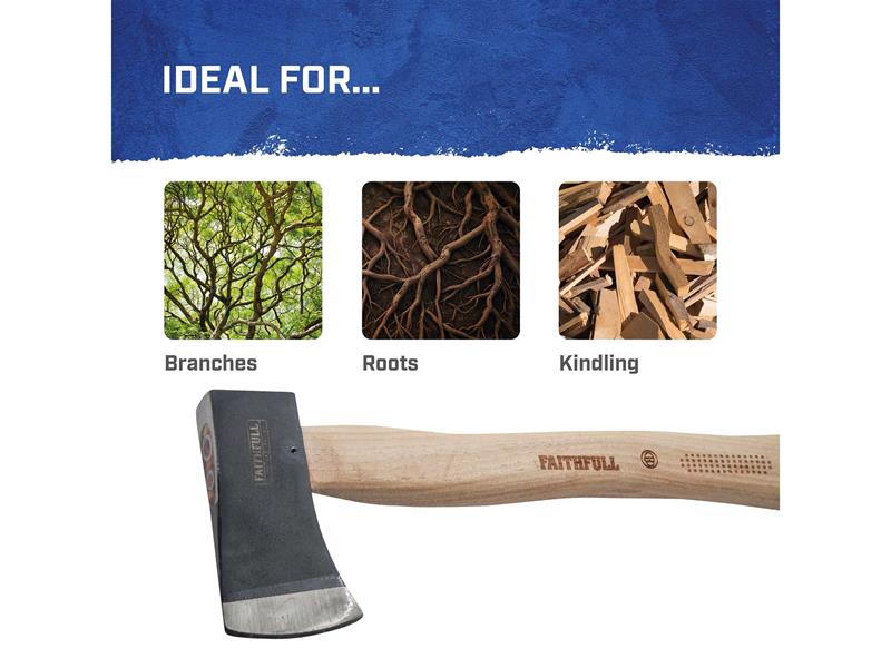 The Faithfull FSC Hickory Shaft Hatchet is ideal for trimming branches and root growth. Manufactured from carefully hardened and tempered quality carbon steel, the head is fully ground with polished cutting edges which are protected by a blade guard. Fitted with a traditional hickory handle which is known for its strength and ability to absorb impact. Made with FSCĀ® 100% Certified Wood from well-managed forests.