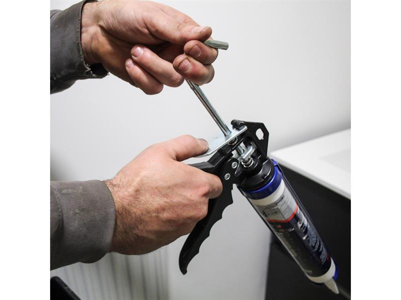 The ratchet has a double spring mechanism for positive and precise sealant feed when the trigger is pulled, and an instant return upon release. Will accept all standard size adhesive and sealant A handy nozzle cleaning pin is provided on the handle.