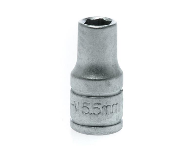 A professional matt chromed 1/4in square drive socket, produced in accordance with ISO 9000 and AS954 specifications, for increased torque and reduced risk of rounding fasteners. This hexagonal socket has a relatively short depth and a stepped collar on the shank.
