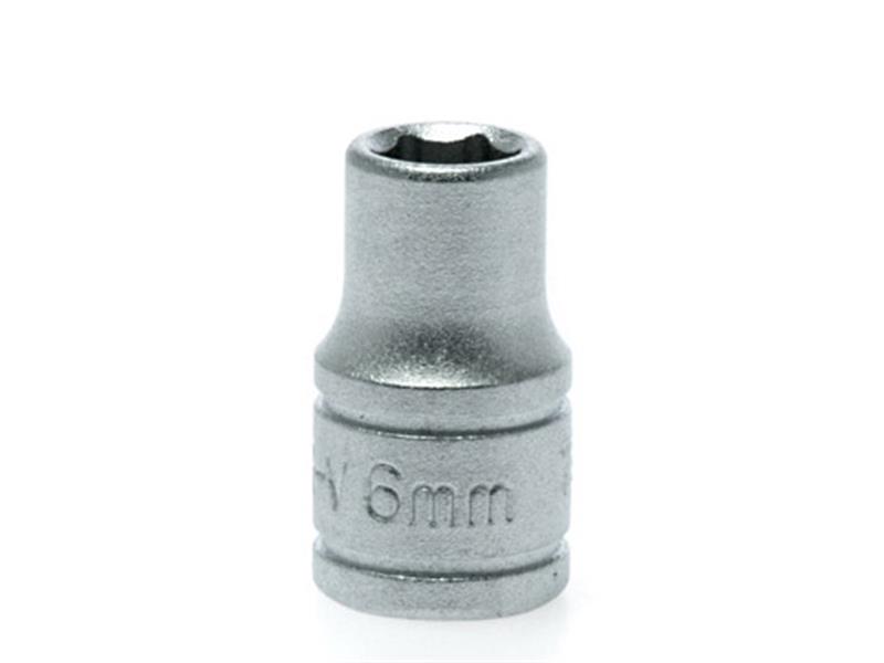 A professional matt chromed 1/4in square drive socket, produced in accordance with ISO 9000 and AS954 specifications, for increased torque and reduced risk of rounding fasteners. This hexagonal socket has a relatively short depth and a stepped collar on the shank.