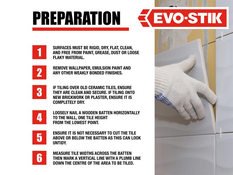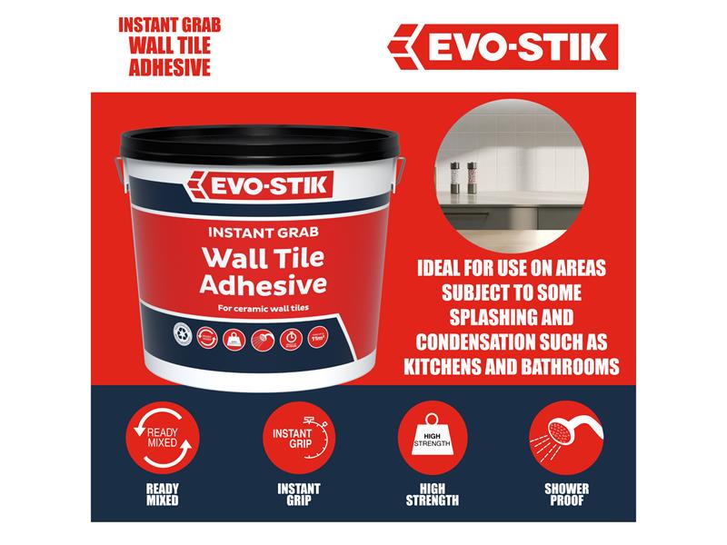 The Evo-Stik Instant Grab Wall Tile Adhesive is for Ceramic Tiles is ready-mixed, easy to use and suitable for fixing ceramic tiles onto most interior walls and backgrounds. It has been tested to EN 12004.