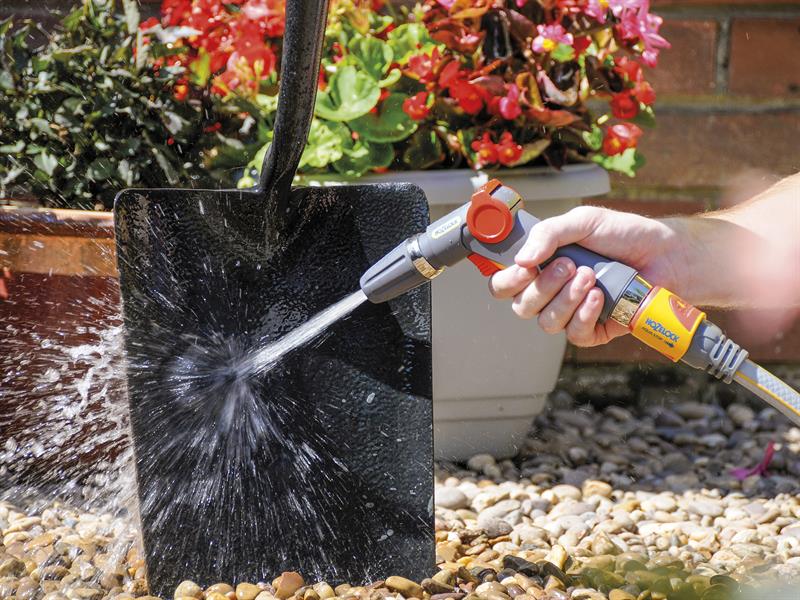 Hozelock Jet Plus Spray Gun with three spray patterns: Cone Spray for plants, Powerful Jet for cleaning, and Fast Fill for buckets and watering cans. Smooth flow control allows quick adjustments to the water output. Push forward with your thumb for maximum power or pull back to reduce water usage by up to 50%. Whether you need a high-power jet for cleaning or gentle watering for flowers, you can choose the perfect spray for every task while protecting delicate plants.