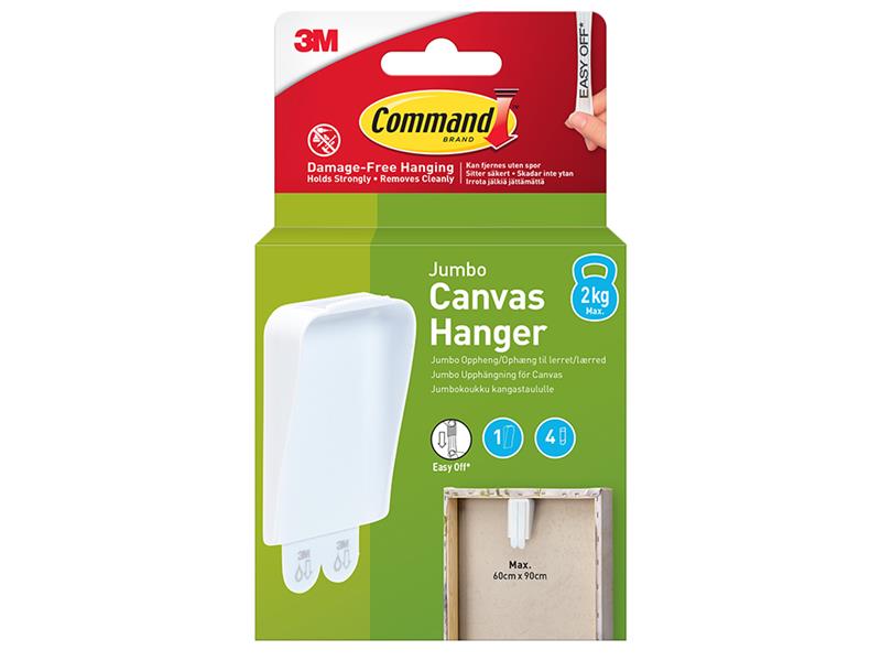 Command™ Jumbo Canvas Hanger. No need for nails or screws. Command™ Picture Hangers are easy to use and help you decorate your walls without leaving any marks. Decorate, organise and celebrate damage free with Command™. Indoor use only. Recommended for use on painted walls, finished wood, painted concrete cinder blocks, laminate, glass, metal and tiles.