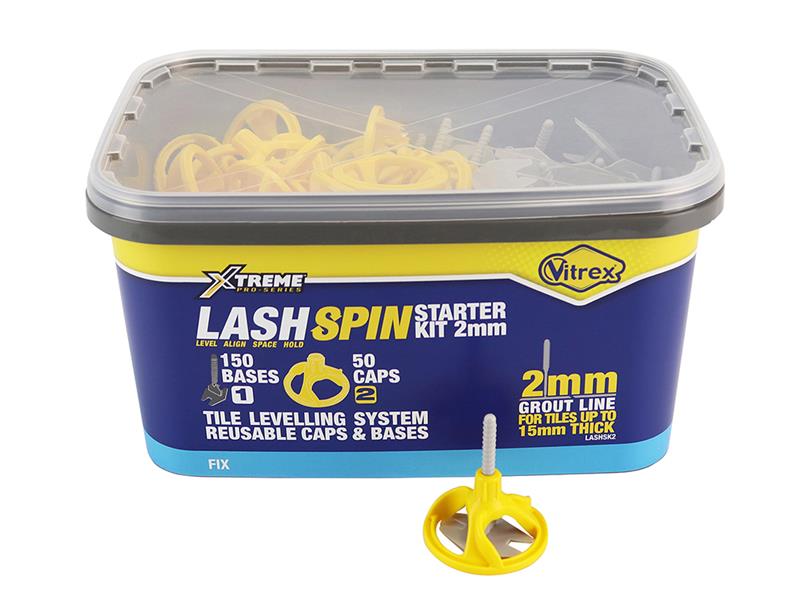 The Vitrex LASHSPIN Tile Levelling System is an enhanced, spin-style version of the original Vitrex LASH system. Featuring a quick-install Spin Cap and interchangeable bases for 2mm or 3mm grout lines, it’s designed for speed, precision, and ease of use. Ideal for large-format tiles, including porcelain, marble, and stone, LASHSPIN completely eliminates tile lippage and ensures a perfectly level finish on both walls and floors.