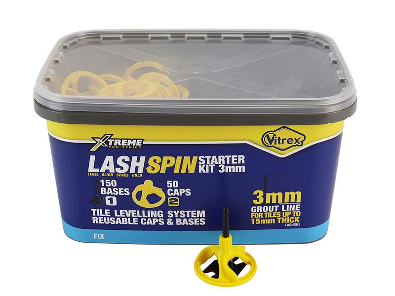 The Vitrex LASHSPIN Tile Levelling System is an enhanced, spin-style version of the original Vitrex LASH system. Featuring a quick-install Spin Cap and interchangeable bases for 2mm or 3mm grout lines, it’s designed for speed, precision, and ease of use. Ideal for large-format tiles, including porcelain, marble, and stone, LASHSPIN completely eliminates tile lippage and ensures a perfectly level finish on both walls and floors.