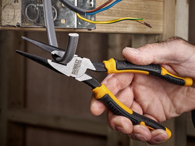 DEWALT Long Nose Pliers are crafted from Chrome Vanadium Steel for reliable performance. Featuring improved hardness depth for durability. The high leverage design increases jaw force, and the fish tape puller adds versatility. Fitted with two-zone COMFORT-GRIP™ handles, contoured for optimal cushion and control.