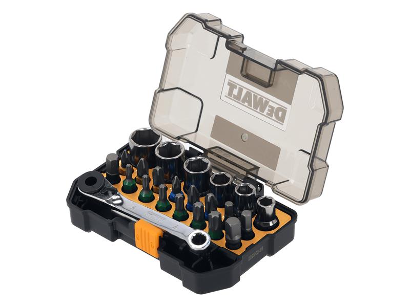 DEWALT 24 Piece McLaren Screwdriving & Socket Set. Supplied in a TOUGH CASE+, this is part of a connectable case system TSTAK™ compatible. Individual TOUGH CASES can be clipped together for easy transportation. Contains: