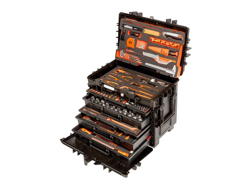 The Bahco MOBILE Rigid Tool Case has 5 full-extension drawers that provide complete access to the case, Each drawer can be easily removed and pushed back in. The 5 drawers are protected by a central lock with key.