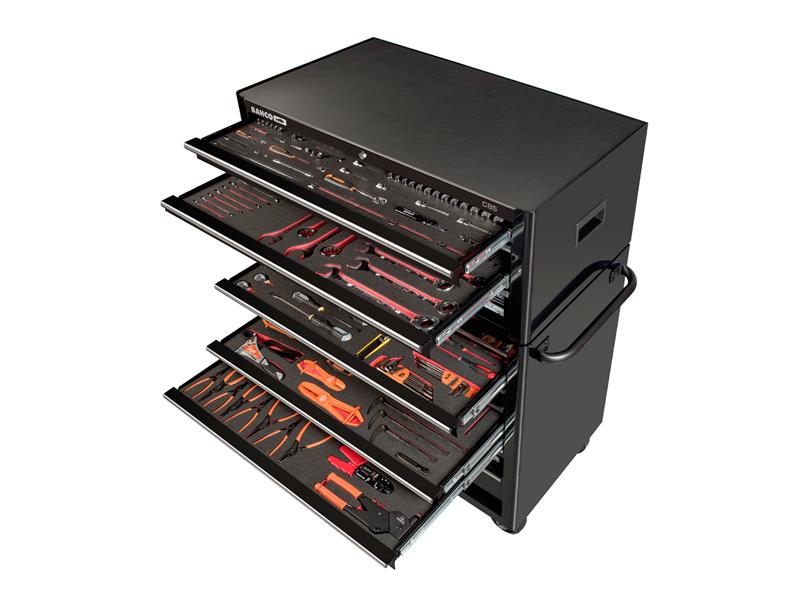 Heavy-duty 40in Tool Trolley composed of 8 drawer C75 Trolley plus 4 drawer E85 Top Chest. The fully opening drawers have an aluminium trim. It has a sturdy steel construction. The double walled case is strengthened with strategically positioned welds. A scratchproof powder coating outside and inside ensures high protection against rust