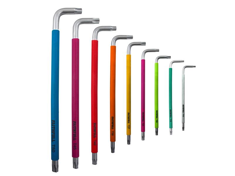 Faithfull Multicoloured Star Key Set. This professional quality star key set is manufactured from S2 steel which makes it highly resistant to impact. The keys are colour-coded to allow for easy size identification and are held together by a plastic clip with a twist and lock action to secure the keys into their slots.