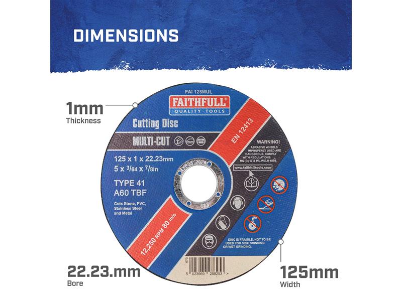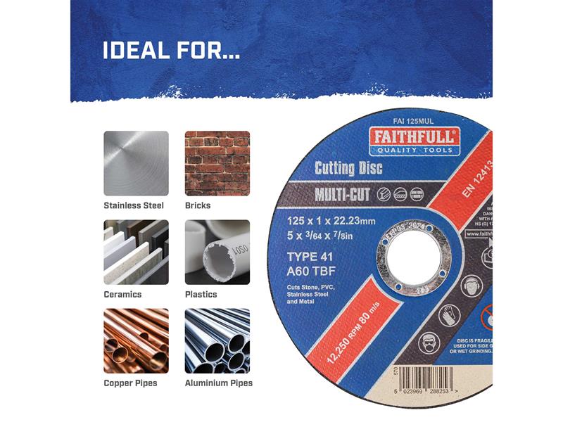 The Faithfull Multi-Cut Cutting Discs will cut a wide range of materials used in the construction and fabrication industries. At only 1mm thick they are able to provide a fast cutting action with less waste and dust. Multi-Cut discs solve the problem of cutting several different materials at once and are ideal for cutting modern-day composite materials used throughout industry. Will cut sheet metal, stainless steel (inox), pipes and profiles, brick, stone, ceramic tiles and other building materials along with plastics/ PVC.