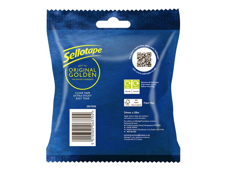 Sellotape Original Golden Sticky Tape is an office and household essential. Provides an everyday solution for most sticking tasks, including wrapping presents, sticking paper, card, envelopes and all sorts of household objects. Golden in colour, but clear when applied. Fitted with a starter tab for easy use. Its easy to tear, no need for scissors. Anti-tangle for better control of the unwinding.