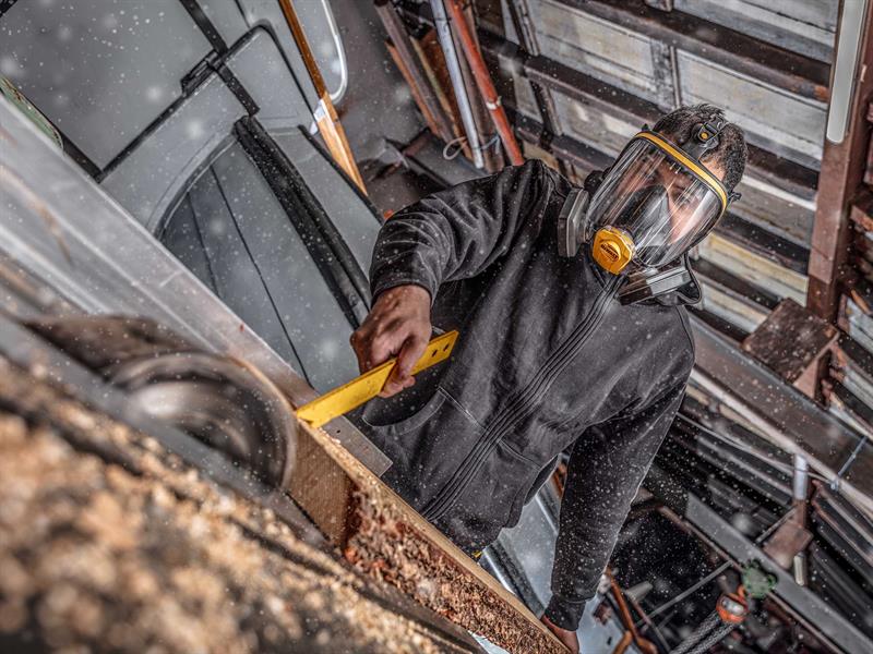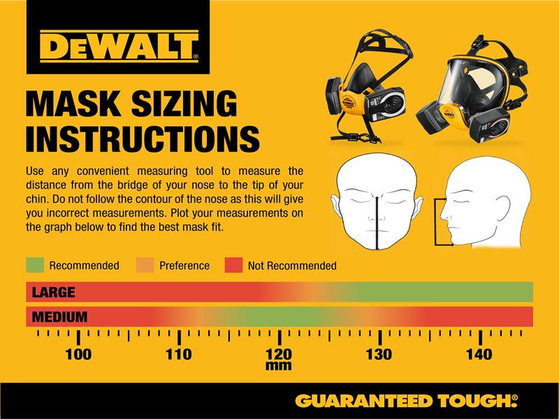 DEWALT Reusable Full Mask Respirator with P3 filters. Provides protection in workplaces which have high incidences of fine dust, lead, silica, MDF particles, or other forms of industrial pollutants in the air.