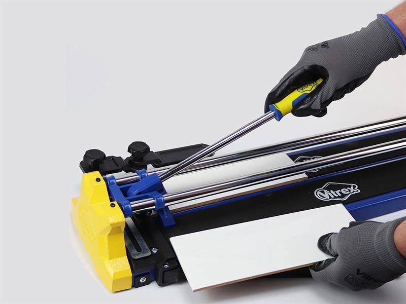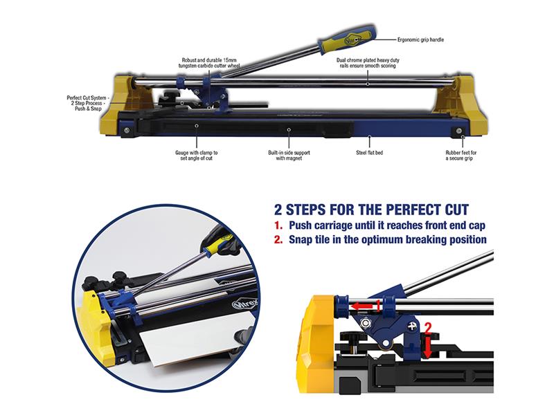 The Vitrex Perfect Cut Manual Tile Cutter makes tile cutting simple. Our innovative two-step Perfect Cut system delivers clean, precise breaks every time: push the carriage to the front end cap, snap, and you’re done. With a reversible mitre guide for perfect angled cuts, a magnetic built-in side support, this tile cutter makes light work of both ceramic and porcelain.