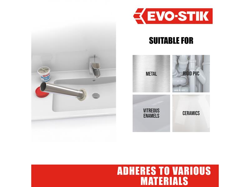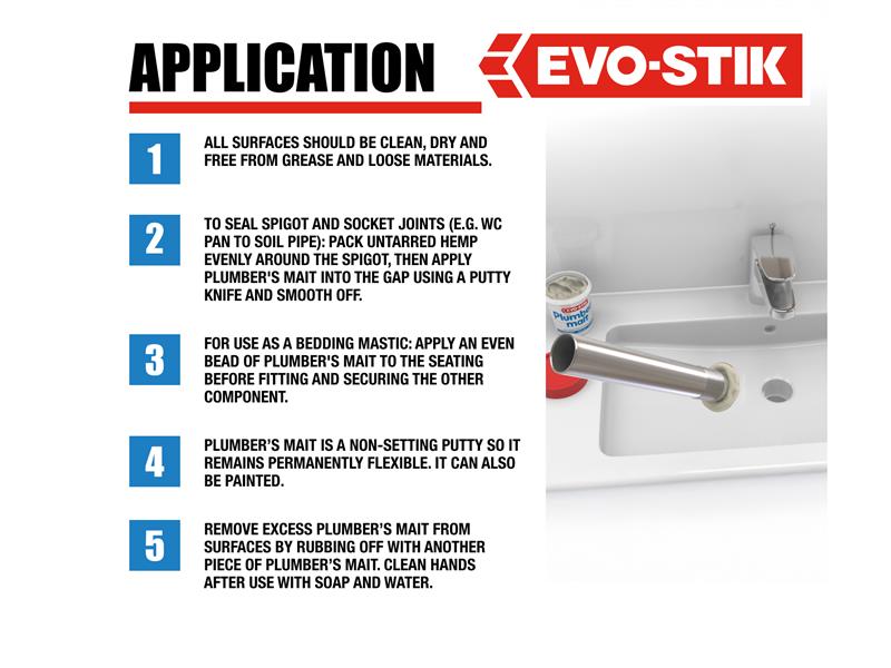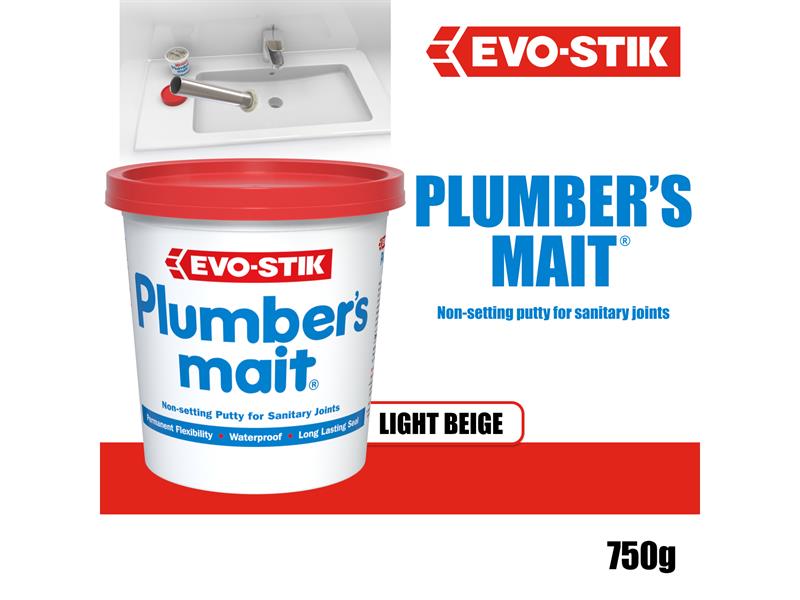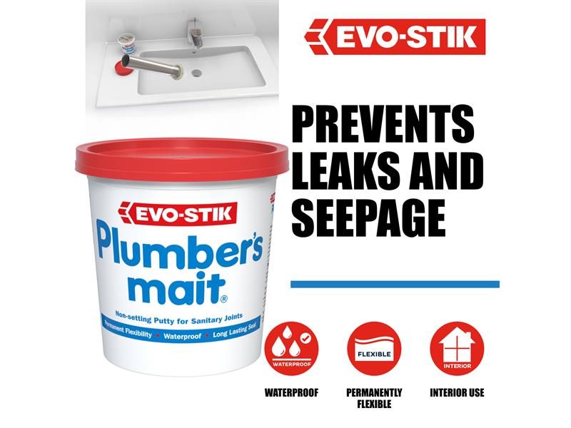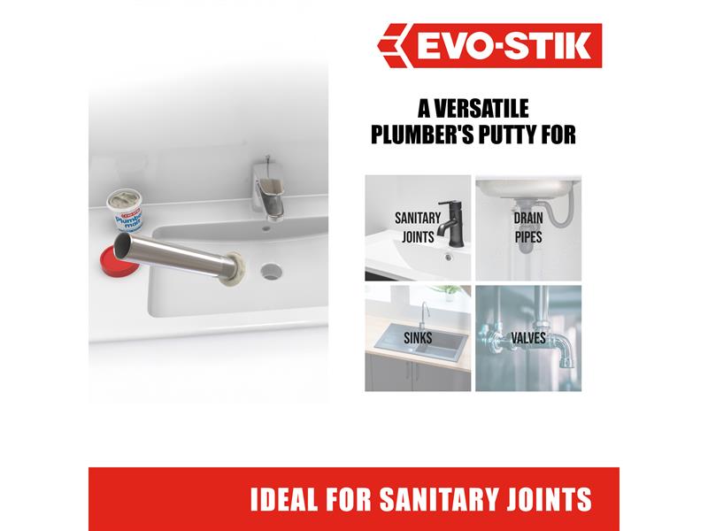 Evo Stik Plumbers Mait®, a waterproof non-setting, non-cracking putty for use in sanitary installations. It provides a watertight seal that can be overpainted. Permanent flexibility allows for joint movement.
