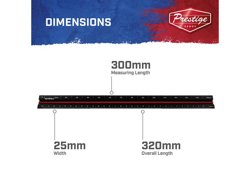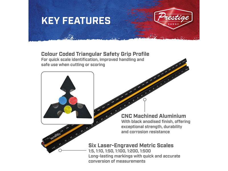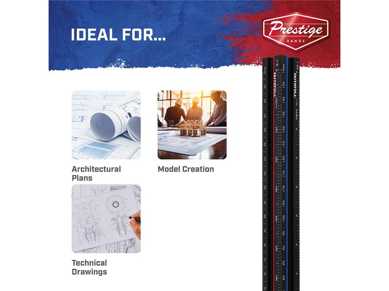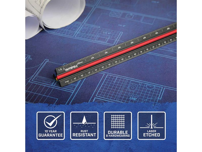 The Faithfull Prestige Tri-Scale Engineer and Architect Rules are commonly used to convert ratios with scales when making precision drawings. This model features 6 scales that can be easily recognised thanks to the colour coded inserts. The unique triangular profile keeps fingers away from knife blades when used for cutting or scoring card etc.